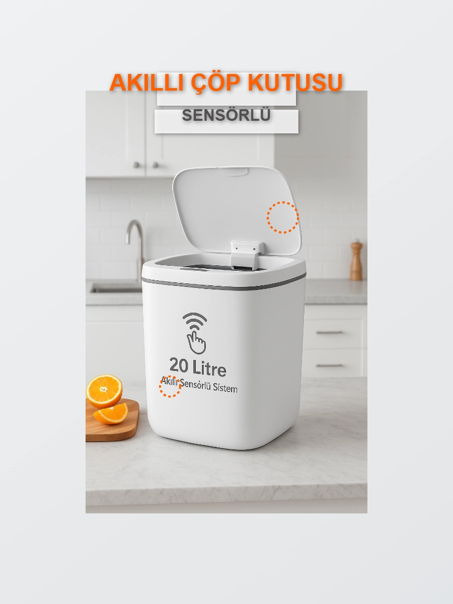 20L Sensörlü Akıllı Antibakteriyel Çöp Kovası Otomatik Kapaklı, Banyo Mutfak 4 Pil Yanında
